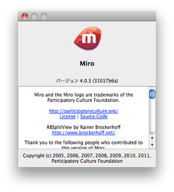 Miro(ミロ)は、ローカルディスクの音楽や動画をまとめて管理できるほか、インターネットテレビやPodCast(ポッドキャスト)などネット上の映像や音楽も簡単に楽しめる、多機能なMac向け総合メディア管理アプリです。AVI、 XVID、 WMV、 MP4、FLVなど多彩な動画ファイル形式にも対応し、ローカルからオンラインコンテンツまでまとめてMiroから楽しめることが特徴です。Miroを使って動画の一元管理の使いやすさを体感してはいかがですか。